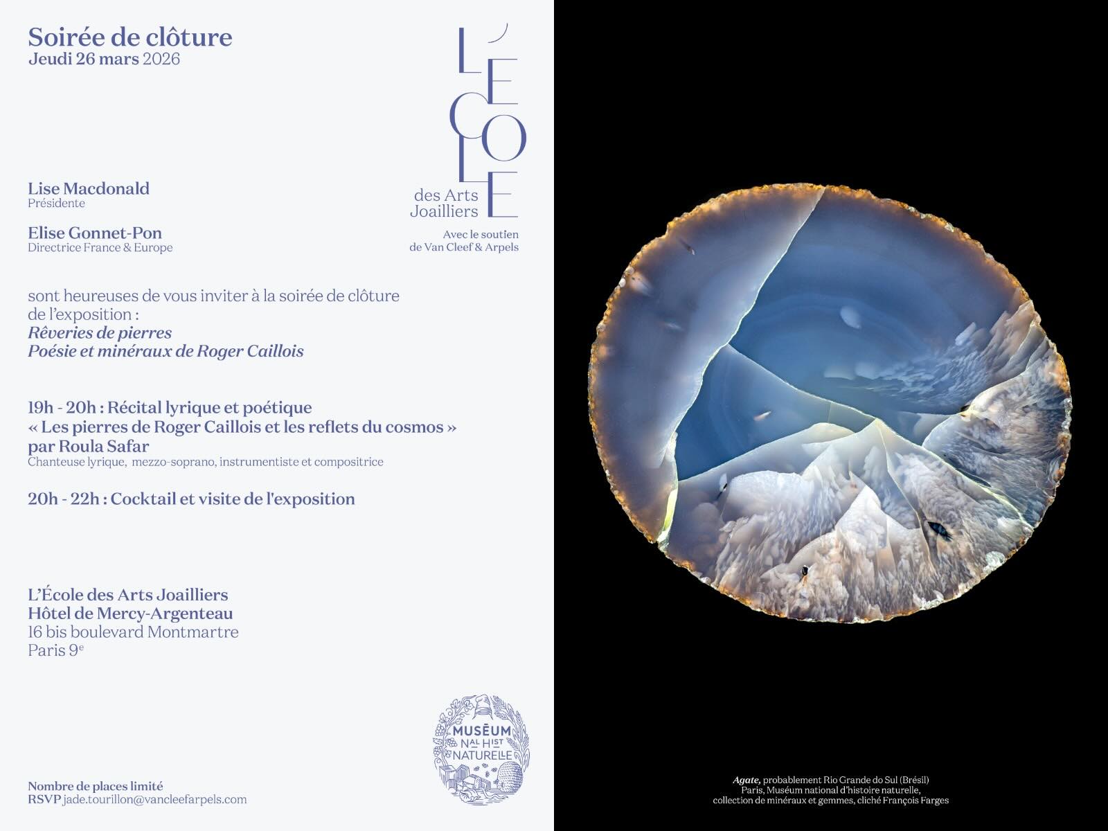 Soirée de clôture de l’exposition : Rêveries de pierres, Poésie et minéraux de Roger Caillois à l’Ecole des Arts Joailliers
